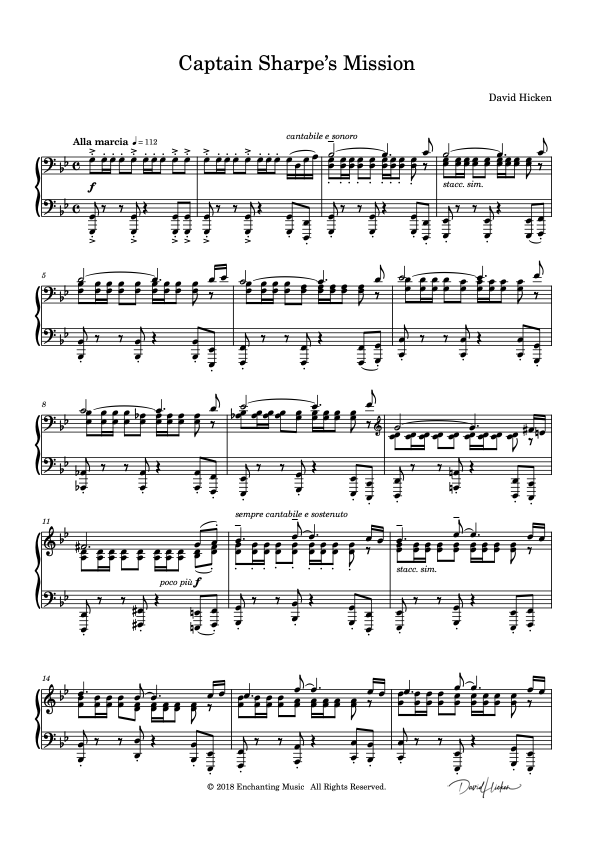 When I first found "Captain Sharpe's Mission" a few years ago, I was enthralled! The fascinating rhythms keep the listener in suspense until the piece's dramatic conclusion. Unfortunately, at the time, the piece was too difficult for me, and I shelved it until I could learn this epic nine-page work.