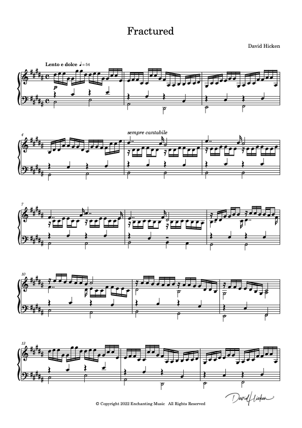 Sandra Waldron As always, I find David Hicken's music unique, touching, and heart-felt. This surprised me, as it is a bit shorter than most of his masterful works. However, I still love it, as I do all of his music. I was able to sit down and play it right through. It is relatively simple but touching. I am never disappointed by his works.