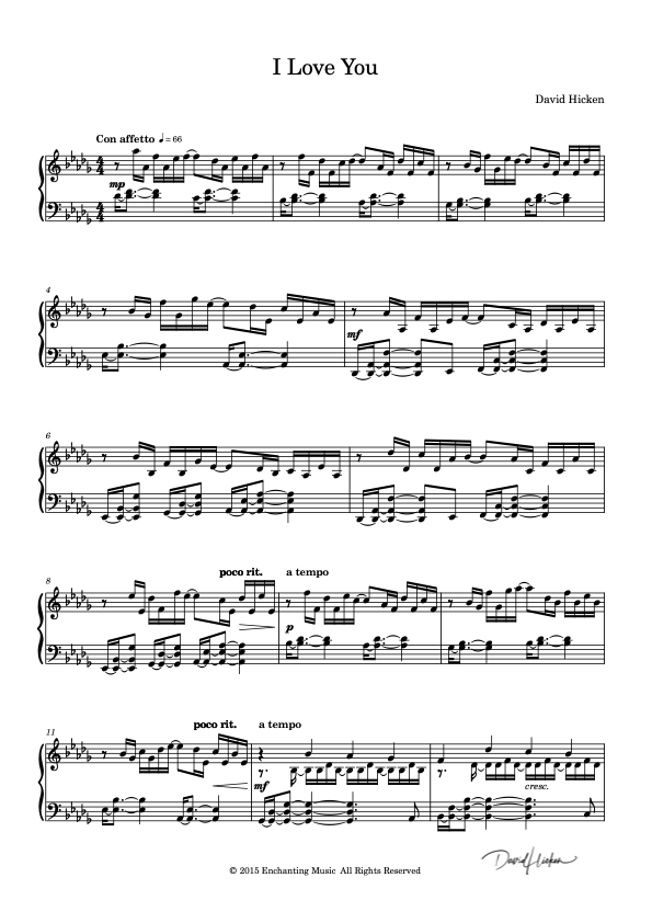 Cathy Bujold I am a professional church musician and have played many of David Hicken's piano pieces in worship. "I Love You" is currently my favorite piece and I'll be playing it this coming Sunday. Every time I play a David Hicken piece, I get many compliments. His music is so relatable and it transports people when they listen to it.